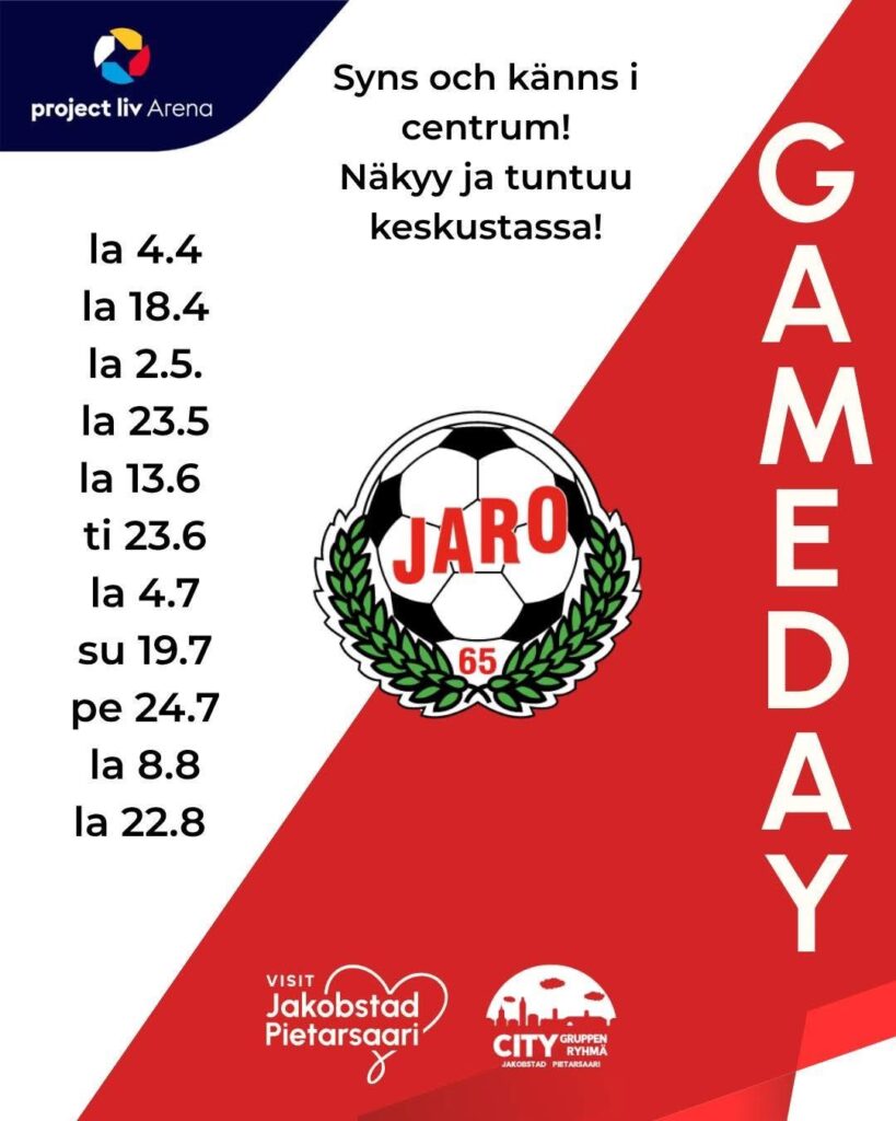 Joka kerta kun FF Jaro pelaa kotiottelun Project Liv Arenalla, kaupunki herää eloon. Yli 20 yritystä Pietarsaaren keskustassa tarjoaa upeita etuja, joita et halua missata. Hyödynnä tilaisuus hankkia uusi kampaus, nauttia kauneushoidoista, tehdä ostoksia ainutlaatuisissa liikkeissä, nauttia hyvästä ruoasta tai ottaa kylmä juoma. Etsi Gameday-lippu ja löydä mahtavia tarjouksia.